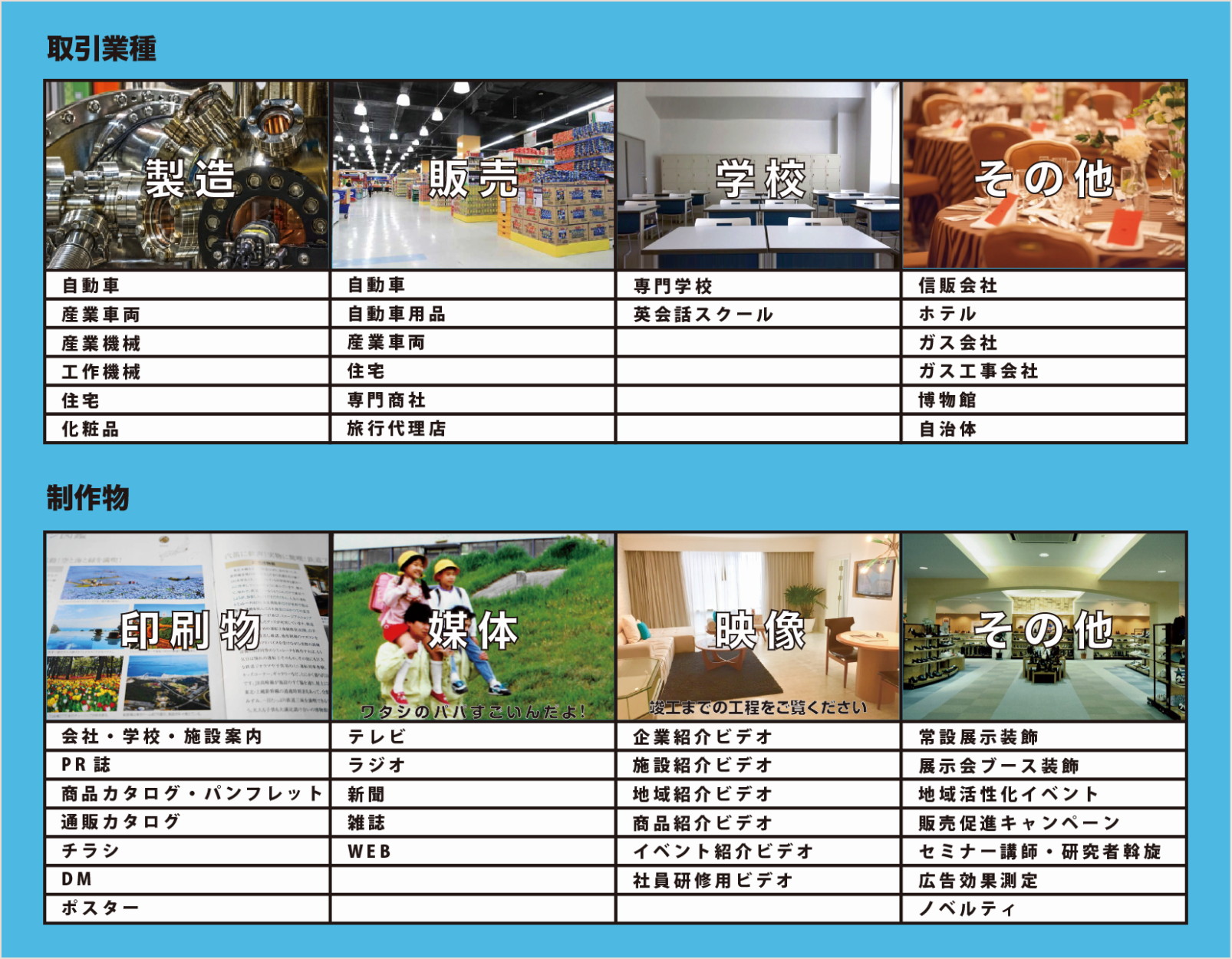製造業関連のお客様が最も多く、 広告・販促・広報に関わる制作を実施しています。